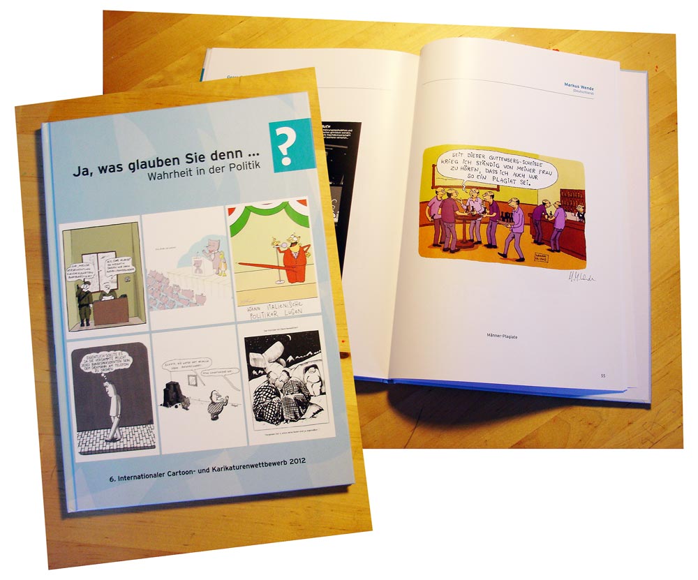 Im Frühjahr 2012 hatte ich am internationalen Cartoon- und Karikaturenwettbewerb aus Aachen teilgenommen. Jetzt wurde endlich der Katalog heruasgegeben und ich stolz darauf, meine erste offizielle Cartoonveröffentlichung vorweisen zu können. Der Druck ist zwar etwas matschig und zu dunkel – aber was macht das schon.