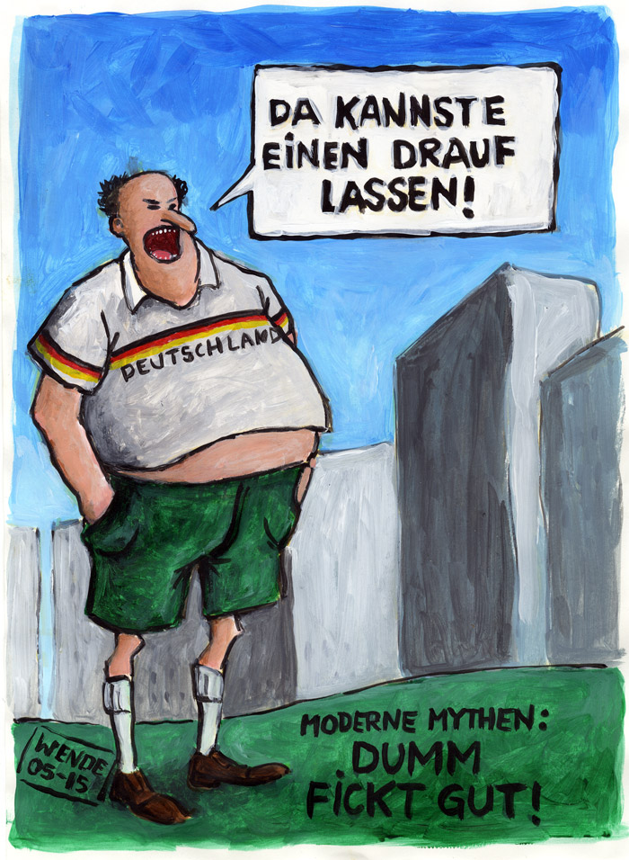 Cartoon: Bowie-Party – „Nun guck sich mal einer an, wie bekloppt sich unsere Frauen für die Bowie-Party zurecht getakelt haben!“