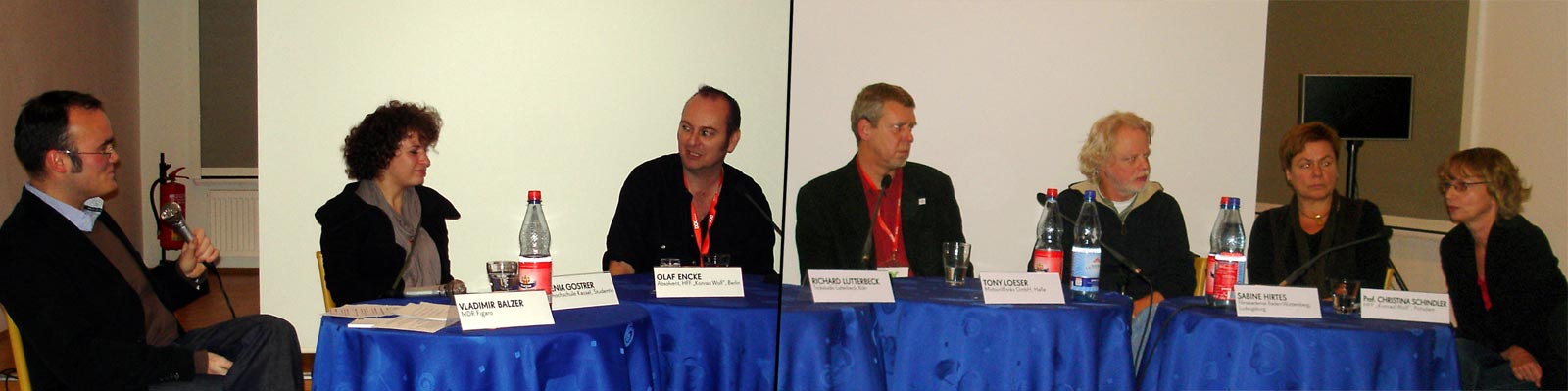 „Hochschulvertreter und Studiobetreiber, Studierende und Absolventen diskutieren über das Selbstverständnis des Nachwuchses und das der Hochschulen, über Marktanforderungen und -wünsche, über Formen der Zusammenarbeit, Risikobereitschaft und die Förderungsmöglichkeiten junger Talente.“