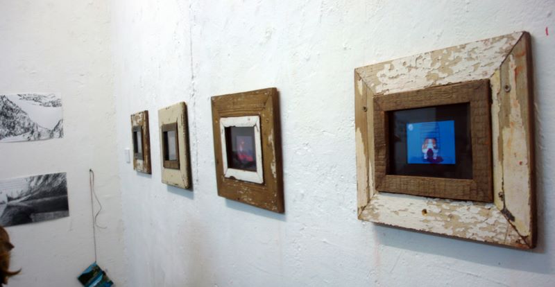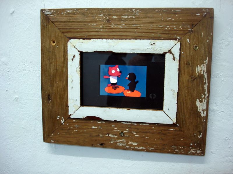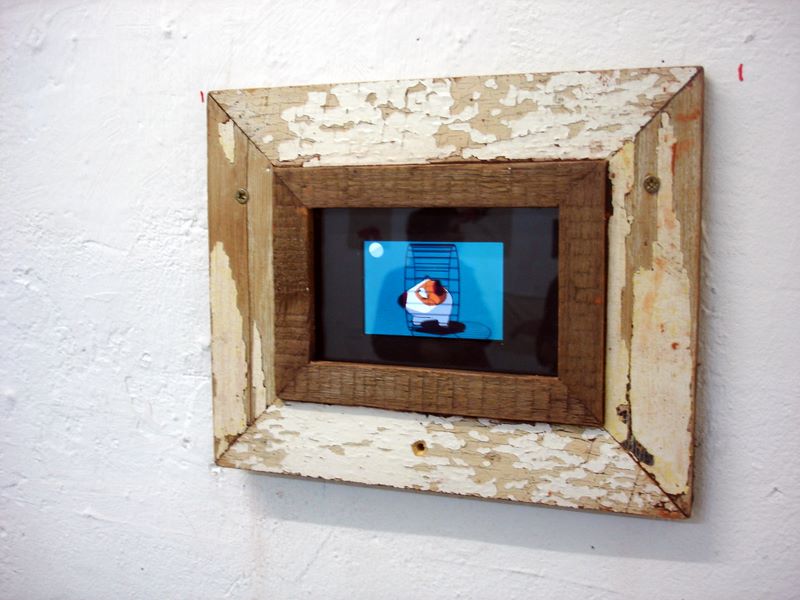 MIC präsentierte seine ca. 10 bis 30 sekündigen Loops auf kleinen mobilen Abspielgeräten, die im schönen Widerspruch zu den verwitterten Holzleisten standen, mit denen sie gerahmt waren. Die Ausstellung lief in Hamburg nur 3 Tage lang, und ich würde mich freuen, wenn MIC seine Arbeiten – oder noch besser die gesamte Ausstellung der Gruppe – in Berlin zeigen könnte. Ich konnte den meisten der Arbeiten sehr viel abgewinnen, am einfachsten erschließen sich mir solche, die illustrativen Charakter haben. So habe ich mich noch sehr über den Comic vom Imke Staats und die Beiträge von Ebeneeza K. gefreut. Aber das ist überwiegend persönliche Geschmackssache und soll die anderen Teile der Ausstellung nicht minder werten.