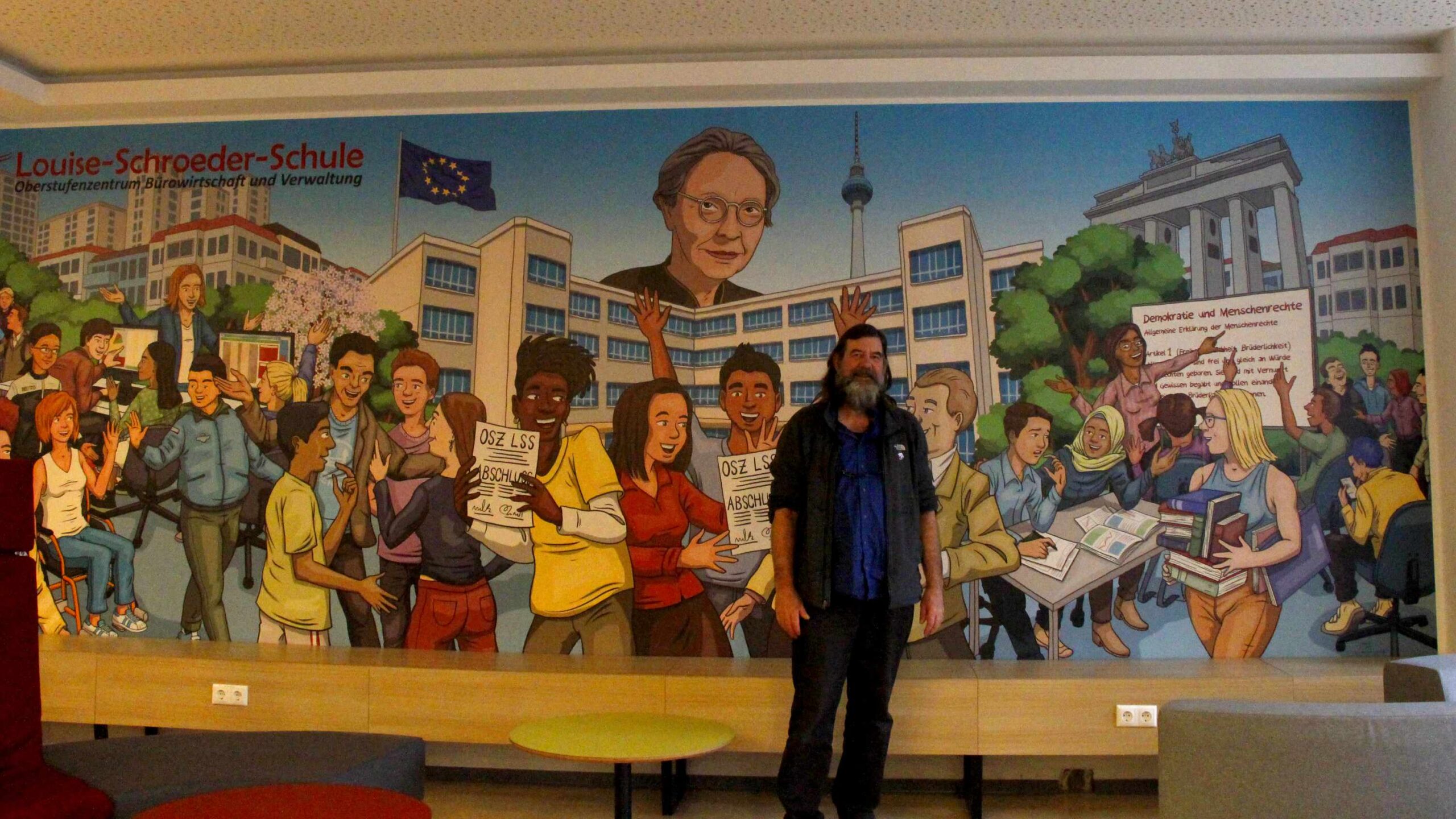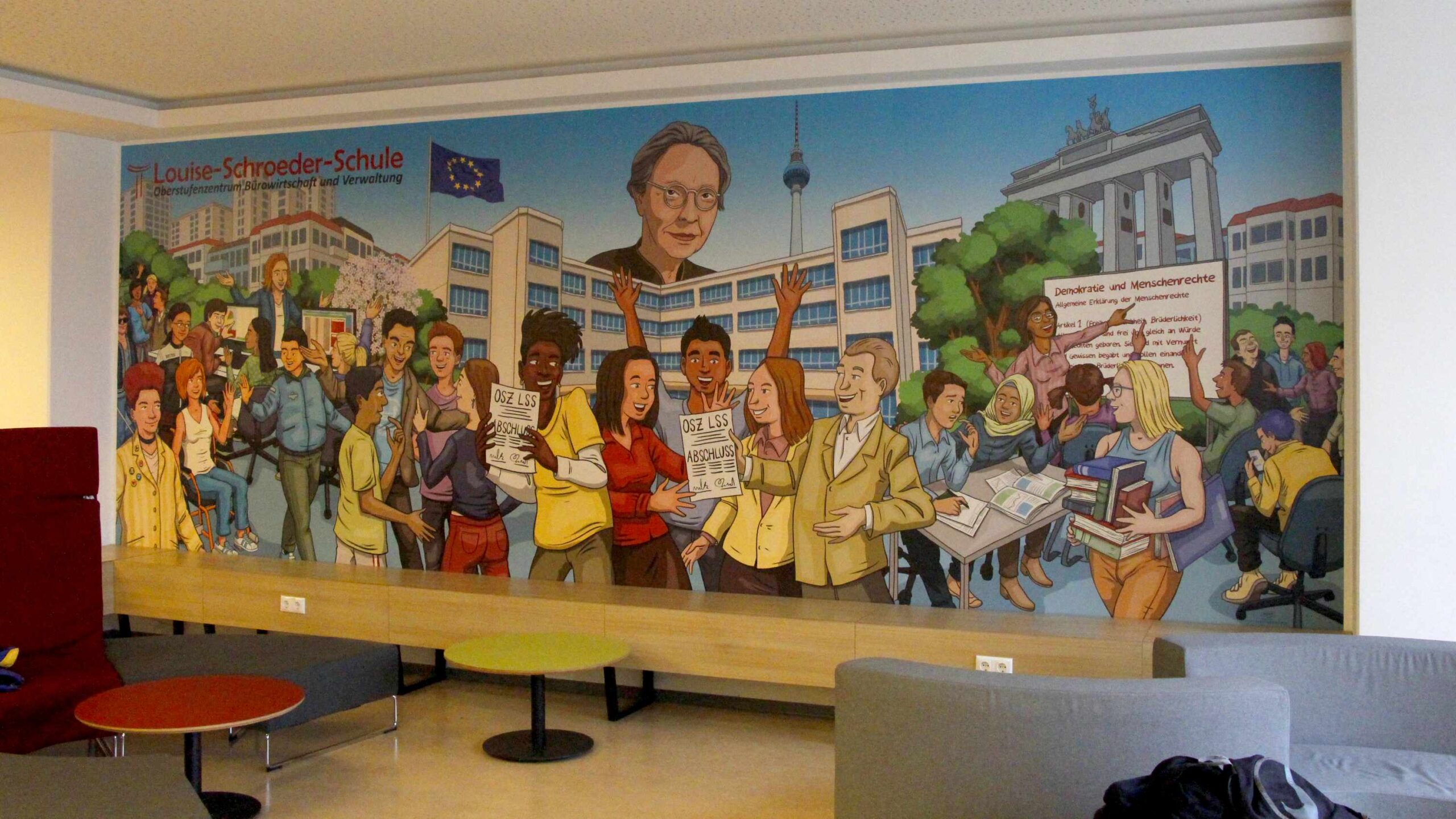 Die 2,4m x 6,8m große Illustration bietet einen Blick in das Schulleben an der Louise-Schroeder-Schule. Rund 2500 junge Menschen unterschiedlichster Herkunft, unterschiedlichster Familien und mit unterswchiedlichsten Geschichten werden an dem Oberstufenszentrum für Bürowirtschaft und Verwaltung ausgebildet und auf ihre Berufe vorbereitet.
